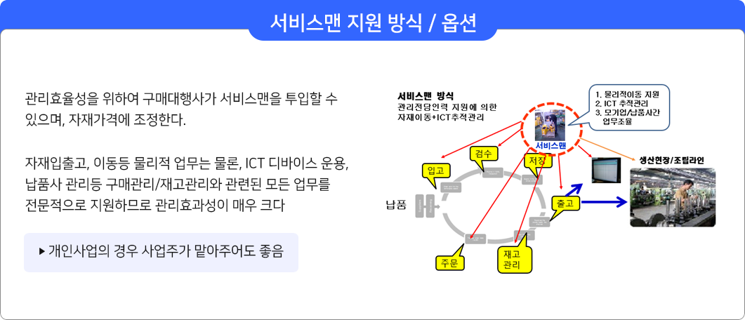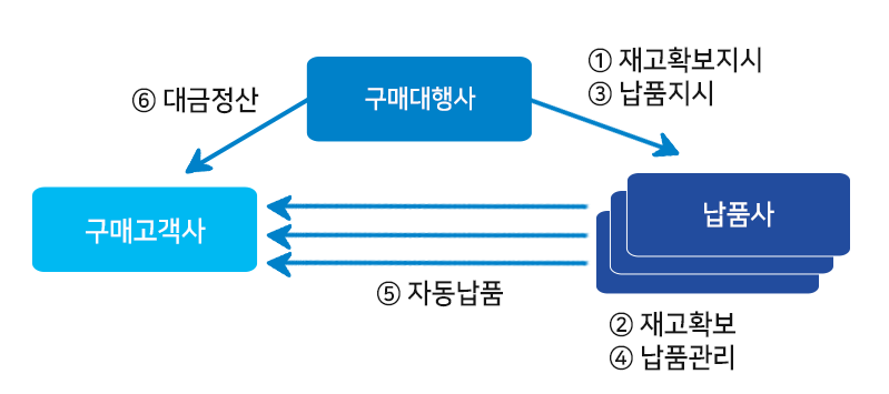사업화 방안 설명 사업-1자동 납품방식 (수수료 방식) 사업-2자동 납품방식 (사용량 정산 방식) 사업-3사용량정산방식 자동납품 구매대행 사업3 사용량정산방식 자동납품 구매대행 – 구매사 사용량에 대하여만 대금청구하는 (원조) VMI 거래방식으로 구매대행사가 개입해주는 구조 (구매대행사가 납품사에서 구매하여 구매사에 판매하는 거래형태) – 구매고객사 기존 재고 인수하여 출발 (정산관리 목적) – 구매대행사 수익구조 지원을 위하여 구매가격 조정이이 필요함 로지텍 코리아 ICT 시스템 운용기능 설명 K-VMI시스템 K-CPFR시스템 2개월 무료체험 참고 영상 보기 해외 시범사례 국내 시범사례 사업관련 동영상 설명 사업화 알아보기 사업화 방안 설명 자동 납품방식 (수수료 방식) 자동 납품방식 (사용량 정산 방식) 사용량정산방식 자동납품 구매대행 상호 : 로지텍코리아 | 대표자명 : 김덕한 주소 : 경남 창원시 성산구 완암로 50, SK테크노파크 테크동 710호 대표번호 : 070-4489-5301 | 메일 : dhkim@logitechkorea.co.kr Copyright ⓒ Logitechkorea All Rights Reserved
